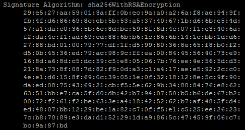 - Signature Algorithm: mostra a assinatura da CA na chave pública assinada. A CA assina um certificado com a chave privada da própria CA. Também mostra com o algoritmo usado na assinatura. Ex:
