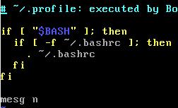 Definição 1: seria o "/etc/profile" individual para cada usuário. Definição 2: arquivo que contém o perfil individual de cada usuário. É neste arquivo onde se colocam o ambiente/programas/comandos para um usuário em específico que serão válidos/executados no momento do login. Este arquivo é lido depois dos arquivos "/etc/profile" e "/etc/bash.bashrc", respectivamente". Geralmente, o arquivo " ~/.bash_profile" fica em "/home/~/". Já o "~/.profile " fica em "/root/". Contudo, alguns já estão usando o "~/.profile" para todos os usuários do sistema. Esse arquivo pussui uma chamada de sistema para o "~/.bashrc", conforme figura a seguir: |