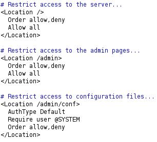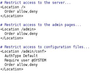 Irão aparecer outras linhas como as da figura a seguir. Veja que elas representam as páginas web do cups. O "Location /" é o "https://172.16.200.193:631/", o "Location /admin" é o "https://172.16.200.193:631/admin" e o "Location /admin/conf" é o "https://172.16.200.193:631/admin/conf".