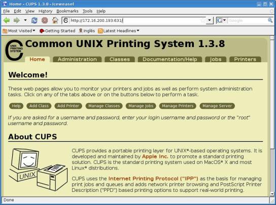 Pronto, agora já se pode acessar a interface web do CUPS de qualquer equipamento, conforme figura a seguir: