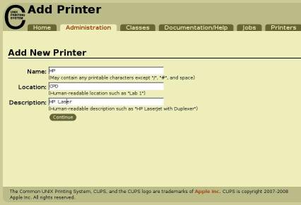 Clique na aba "Administration" e em "Add Printer"(conforme figura a seguir, digite o "Name", "Location" e "Decriptions". São meramente informacionais)