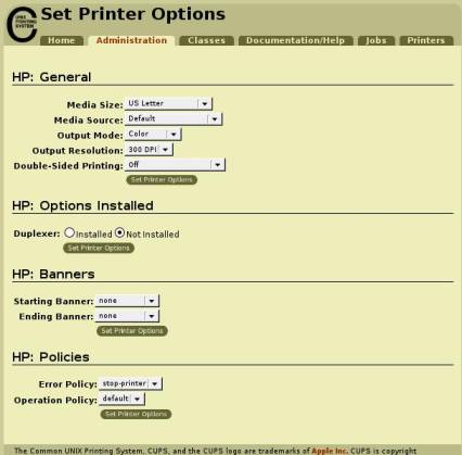 Agora aparecerá uma página de configuração da impressora, como na figura a seguir. Faça as configurações necessárias e clique em "Set Printer Options" para gravar as modificações: