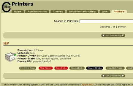 Obs: ao adicionar uma impressora pela primeira vez, o arquivo "/etc/cups/printers.conf" é criado automaticamente. Ele contém todas as informações usadas ao adicionar a(s) impressora(s) via interface Web. O mesmo acontece ao adicionar uma classe pela primeira vez, o arquivo "/etc/cups/classes.conf" é criado.