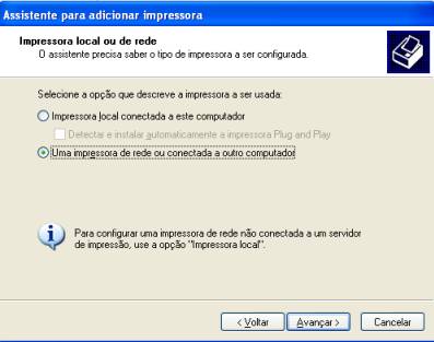 Selecione a opção "Uma impressora de rede ou conectada a outro computador" e clique em "Avançar".