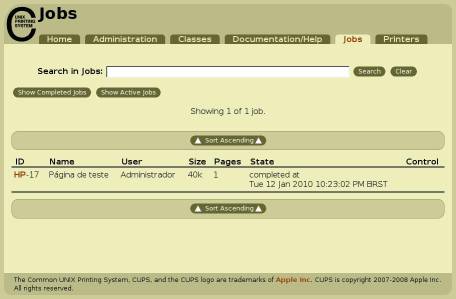 Clique em "Avançar", escolha o driver da impressora e clique em "Concluir". Mande uma página de teste para testa e vá nos JOBS do servidor CUPS para verificar a fila de impress, como na figura abaixo: