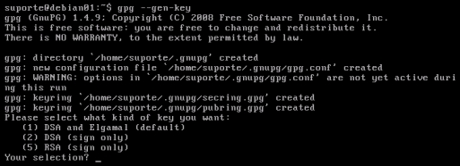 Será solicitada a escolha de um algoritmo. Escolha "DSA and Elgamal":