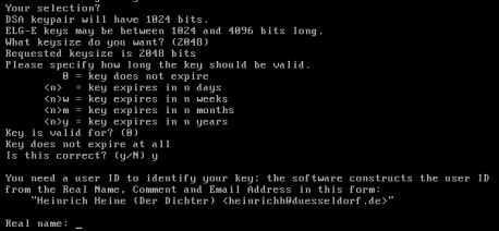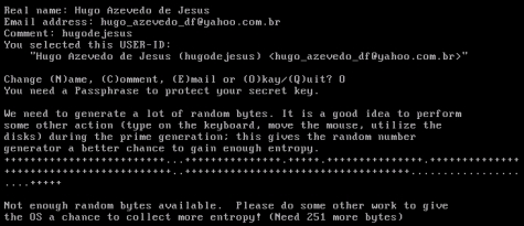 Digite o seu nome completo, o endereço de e-mail, um comentário (pode ser seu apelido) e uma passphrase". Depois disso, o "gpg" necessitará gerar um valor aleatória/radômica (salt) e para isso serão capturadas ações do teclado, mouse, disco etc com o intuito de conseguir uma boa entropia. Então, durante esse momento, movimente o mouse, digite algo no teclado e acesse algum programa: