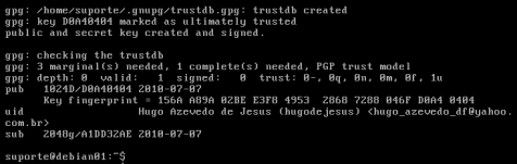 Veja que na figura acima houve um problema que a entropia não foi suficiente. Isso foi proposital, pois deixei o computador parado só para ver o que iria acontecer. Caso apareça essa mensagem, basta fazer os procedimentos solicitados (mexer o mouse, teclado etc) para que essa etapa seja concluída. Veja na figura a seguir que ao se fazer isso um par de chaves vai ser criado e assinado e o seu UID (User ID) aparecerá: