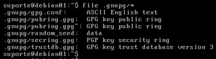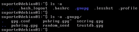 Veja o diretório oculto criado e seu conteúdo, dentro do "home" do usuário atual. O arquivo "~/gnupg/pubring.gpg" é a chave pública e o "~/gnupg/secring.gpg" é a chave privada:
