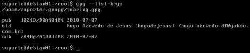 $ gpg --list-key (lista a chave pública e as informações contida nela, conforme figura a seguir)