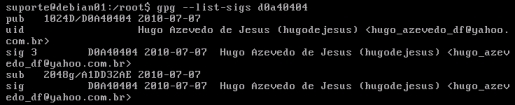 $ gpg --list-sigs D0A40404 (idem, só que especifica o "número identificador da chave". Isso é importante, pois um usuário pode possuir mais de um par de chaves)