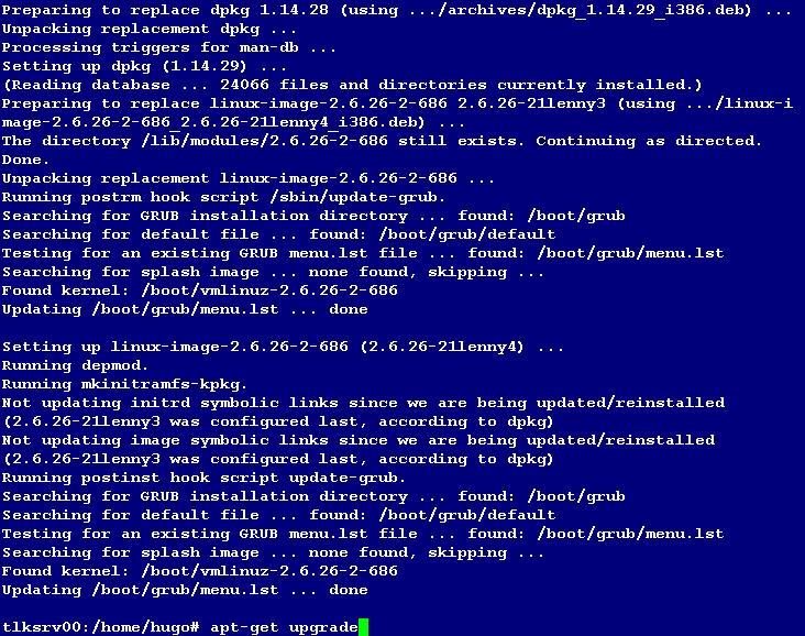 Obs: ao atualizar ou instalar um novo kernel com o comando apt-get upgrade ou apt-get install, o arquivo "/etc/grub/menu.lst" é refeito. Lembre-se que qualquer modificação feita fora do padrão será perdida. Ex: vga=0x0314.