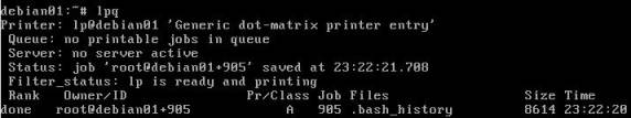 $ lpq (comando usado para verificar a fila de impressão e o status dele. Caso tenha instalado o "lprng", também, existe o comando "lpstat". A seguir tem uma figura da saída padrão do comando "lpq". Veja que temos uma impressão que já foi impressa "DONE", pelo usuário "ROOT@DEBIAN01, de classe/prioridade "A" [varia de A a Z sendo a A a de menor prioridade e é a default], o arquivo impresso foi ".bash_history" de 1127 bytes e começou a impressão as "23:39:45". Temos também outro estado além do DONE que é o ACTIVE para as impressões que estão ocorrendo no momento)