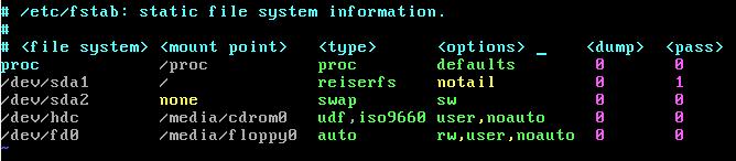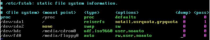 # vi /etc/fstab (é necessário ativar o sistema de quotas no momento em que se monta a partição. Veja a seguir o conteúdo de um "/etc/fstab" comum)
