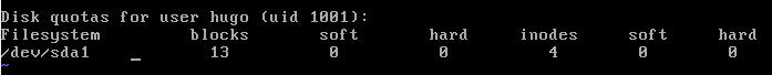 # EDITOR=vi edquota -u hugo (aparecerá o arquivo de configuração de quota para o usuário hugo, como na figura a seguir. Para editar a quota de um grupo digite "EDITOR=vi edquota -g admins")