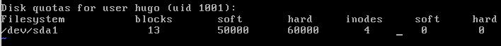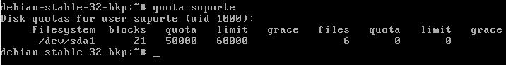 - hard: é a quantidade máxima de KiloBytes reservada para o usuário. Geralmente é um valor maior que o da opção "soft". Ao alcançar esse limite, não se poderá gravar mais arquivos;
