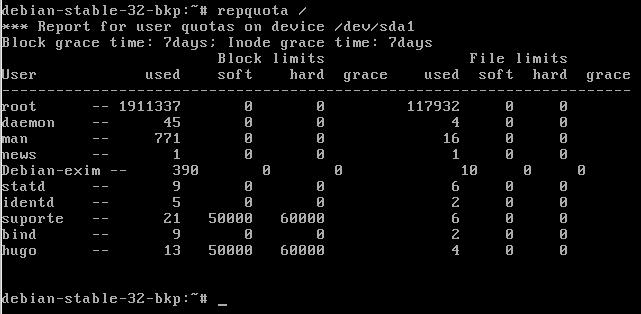 # repquota / (mostra um resumo/report das quotas de usuários do filesystem. Para mostrar "-g" mostrar o resumo do grupo)