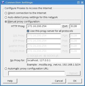 Clique "Manual proxy configuration" e digite em "HTTP Proxy" e em "Port" o endereço IP e porta TCP do proxy Squid, respectivamente